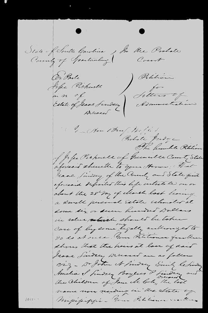 Isaac’s loose-papers estate file in Spartanburg County has a petition filed 12 April 1873 by Jesse Pickrell of Greenville County, naming himself as the maternal uncle of Isaac’s children, and appealing for administration. This gives Isaac’s heirs as Dr. John N. Lindsey, Emily C. Lindsey, Amelia S. Lindsey, Bayless P. Lindsey, and the children of Jane M. Cole, deceased, residing in the state of Mississippi.