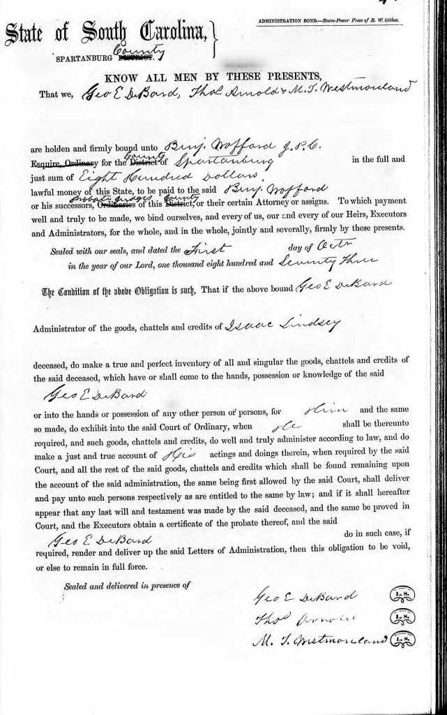 [50] Spartanburg County, South Carolina, Administration and Bond Bk. B, p. 492. The original bond is also in Isaac Lindsey’s loose-papers estate file, Spartanburg County, South Carolina, file 1011.