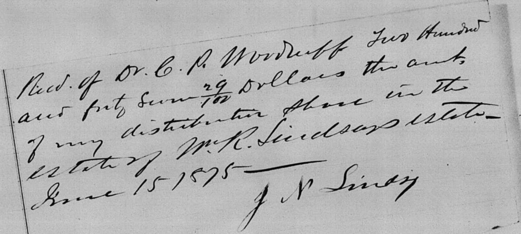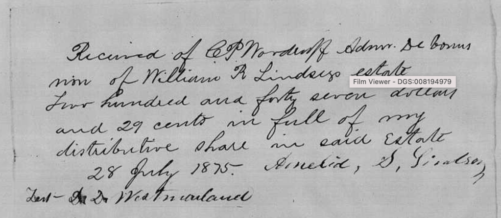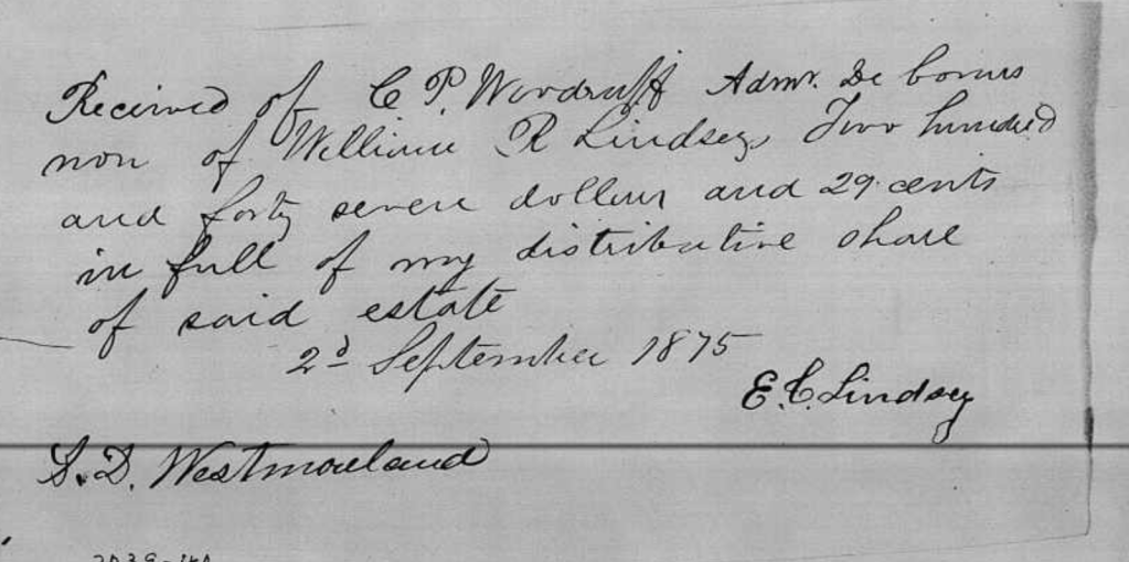 William R. Lindsey’s estate file shows Sterling P. Lanford giving bond on 7 November 1867 for the administration of the estate, with bondsmen John N. Lindsey and T.S. Wright (loose-papers estate file of William Riley Lindsey, Spartanburg County, South Carolina, file 2739). The estate file has an appraisal account whose date I cannot read — and the account itself is illegible, too — because the copy is too dark in the digital copies of Spartanburg County estate files. The appraisal account and sale account were filed 3 February 1868, with the filing showing that the sale was held on 1 Jaunary, with William’s brother John N. Lindsey as principal buyer. The estate file also has a bond of William’s brother John N. Lindsey and C.P. Woodruff for administration of the estate at an unspecified date in 1875 — evidently after William’s father Isaac died and William’s portion of Isaac’s inheritance needed to be distributed to Isaac’s other heirs. The estate file shows William’s heirs being given their distributive shares of his estate on 15 June 1875, named as John N. Lindsey, Emily C. Lindsey, Milly Lindsey, Baylis Lindsey, and the heirs of Jane Cole, deceased.
