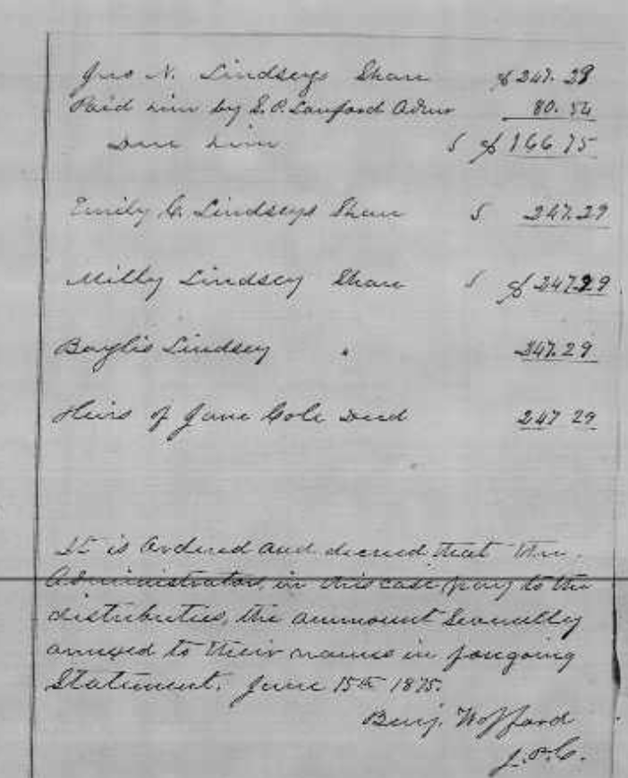 One of two loose-papers estate files for Balus Lindsey in Spartanburg County classifies him as an “idiot pauper” who held an interest in the estate of his brother William R. Lindsey (loose-papers estate file of Balus P. Lindsey, Spartanburg County, South Carolina, file 740). On 6 May 1876, commissioners C.P. Woodruff and S.P. Lanford petitioned for the administrators of William’s estate to pay into the hands of the county commissioners funds for Balus’s upkeep, and the court ordered on 15 June for this to be done.