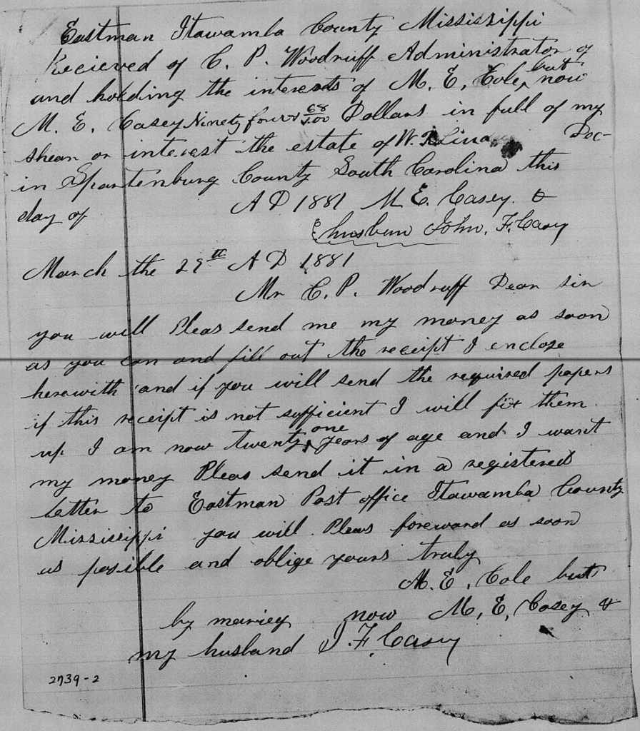 4. Jane M. Lindsey was born about 1835 in Spartanburg County. Jane had died prior to 7 August 1873 when the previously cited notice in the Carolina Spartan newspaper of the probate of her father’s estate states that her children were residing out of state. The loose-papers estate file of her brother William Riley Lindsey (Spartanburg County loose-papers estate files 2739) states that the children of his deceased sister Jane Cole were residing in the state of Mississippi. The file contains a valuable document that allows us to put together a picture of Jane M. Lindsey’s family: this is a 29 March 1881 letter written by William’s niece M.E. Cole of Itawamba County, Mississippi, asking that her inheritance from William’s estate please be sent to her by mail, and stating that she was 21 years old and had recently married J.F. Casey.