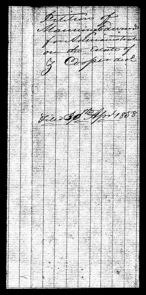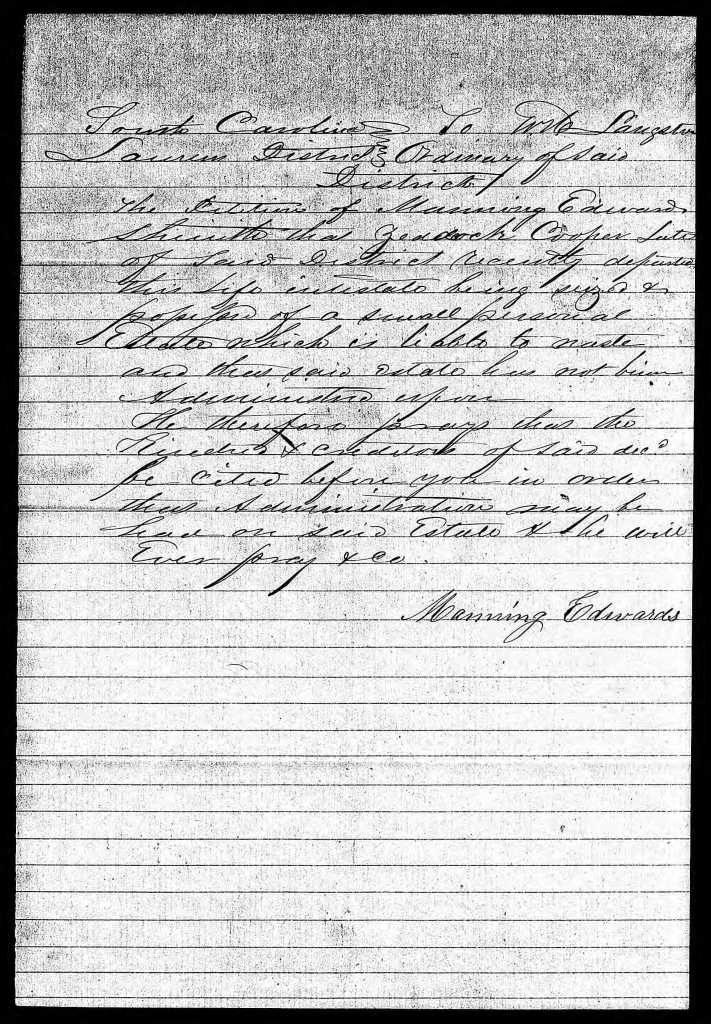 We can determine that Zadock died sometime before 20 April 1858 in Laurens County, because his brother-in-law Manning Edwards petitioned on that date in Laurens County to administer Zadock’s estate, stating that “Zaddock Cooper Late of Said District recently departed this life.”