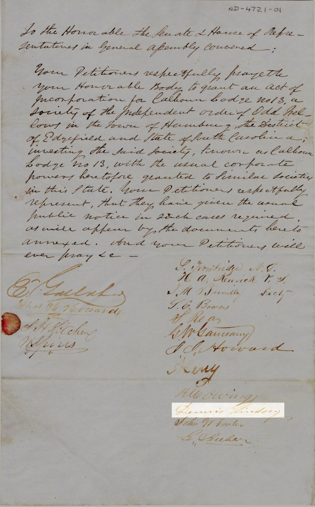 As we saw previously, Dennis signed a petition of Hamburg’s town council and citizens on 1 December 1848 for funds to clear a portion of the Savannah River, with his brother-in-law C.W. Styles signing along with him.[27] At some point in 1849, Dennis was also a signatory to a petition to the state legislature for the incorporation of Calhoun Lodge International Order of Odd Fellows at Hamburg.[28]