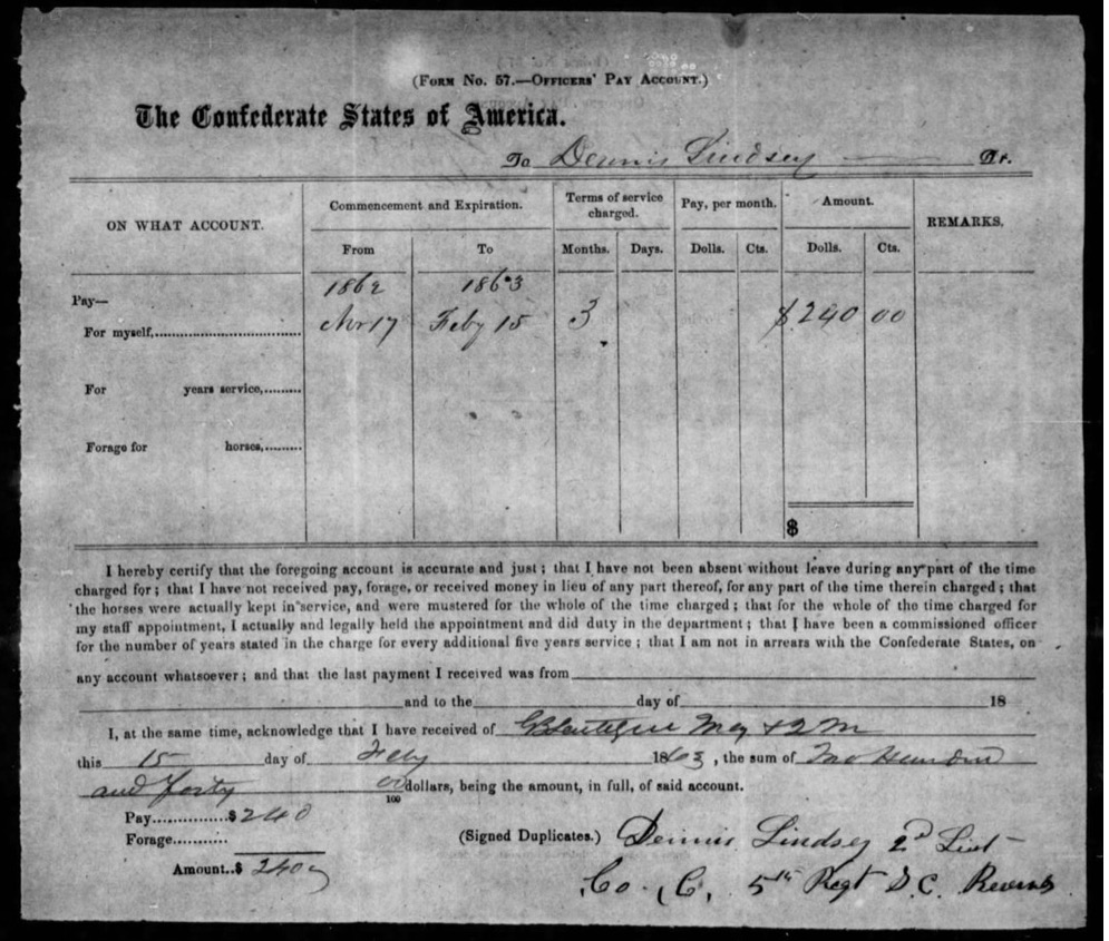On 10 November 1862, Dennis Lindsey enlisted at Hamburg in Captain John B. Holmes’s Company (Co. C) of the 5th Regiment of South Carolina Reserves (CSA), in which he served as a 2nd lieutenant.[48] His service papers give his age as 49 at the time of his enlistment, suggesting a birth year of 1813. They also show him receiving a payment of $240 for service on 15 February 1863, signed as Dennis Lindsey, 2nd lieutenant. The payment form has a receipt attached, which Dennis signed on the day of payment as “Dennis Lindsey 2nd Lieut.”