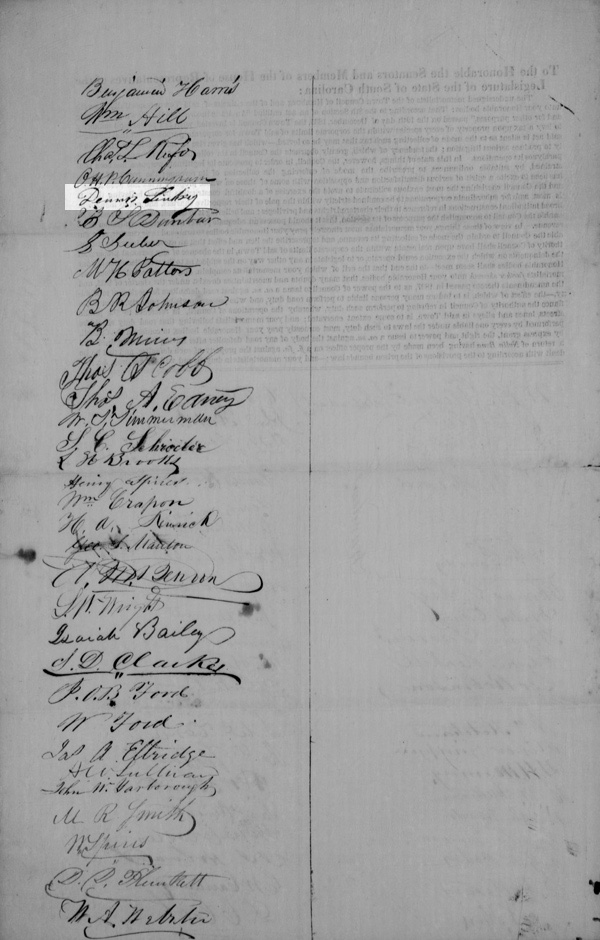 More records of the 1850s show Dennis continuing to be actively involved in the affairs of Hamburg, including as a manager of local elections. On 2 December 1853, a petition to the South Carolina Assembly filed by John E. McDonald and inhabitants of Edgefield District asking to be released from a bond involving a town lot in Hamburg mentions Dennis Lindsey, his brother-in-law C.E. Styles, and O.H.P. Cunningham, whose widow Mary Dennis would soon marry.[35]