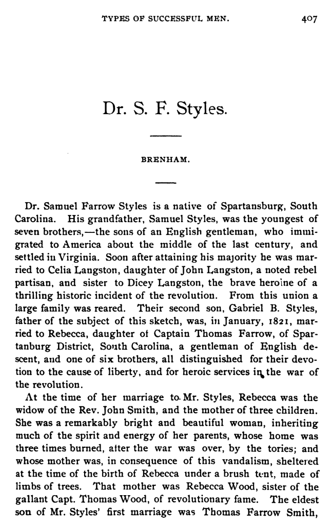 [12] See the biography of Louisa’s brother Carey Wentworth Styles, founder of the Atlanta Constitution, by Raymond B. Nixon entitled “Constitution’s Founder Fought for Georgia with Pen and Sword,” Atlanta Constitution (17 June 1945), pp. 12, col. 1-8. See also Lewis E. Daniell, Types of Successful Men of Texas (Austin: Eugene von Boeckmann, 1890), pp. 407-409.