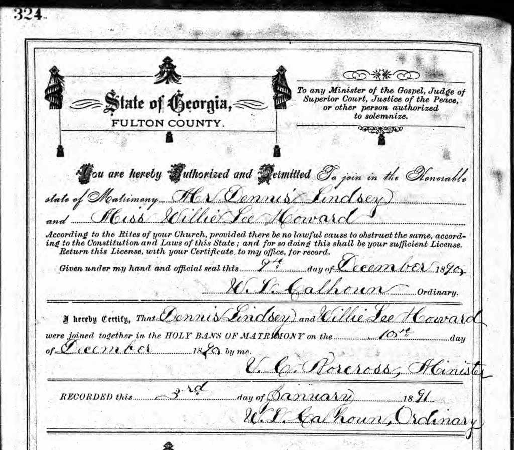 On 10 December 1890 in Fulton County, Georgia, Dennis married Willie Lee Howard, daughter of James William Howard and Fannie A. Smith.[66] The couple’s marriage record shows them being married by Reverend Virgil Chalmers Norcross, a Baptist pastor.[67]