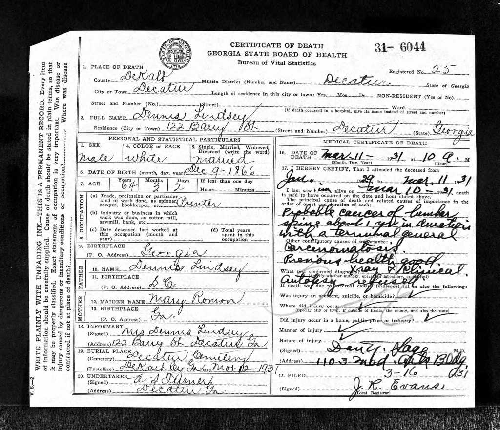 [64] See death certificate of Dennis Lindsey, Georgia Department of Health and Vital Statistics #004582669, DeKalb County, 1931, #31-6044; online at Ancestry in the collection Georgia, U.S., Deaths Index, 1914-1940.