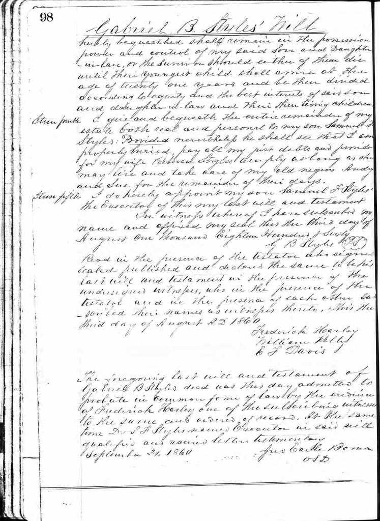 The first bequest Gabriel B. Styles makes in his will is to his grandson Oscar L. Lindsey. The will states that Oscar was the son of Gabriel’s daughter, whose name is not given. Gabriel bequeaths to Oscar an enslaved woman Nancy and her children Charley and Narcissa and any progeny they might have. The will stipulates that if Oscar should die without lawful issue, the enslaved persons and their increase are to be divided among Gabriel’s sons Samuel F. Styles and Carey W. Styles. Oscar is placed by the will under the guardianship of his uncle Samuel F. Styles until Oscar reaches the age of 21, with instructions that Samuel is to see his nephew cared for and educated from funds generated by the work of the enslaved persons bequeathed to Oscar, and if those funds were not sufficient to provide for Oscar, Samuel might choose to sell the enslaved persons and use the proceeds on Oscar’s behalf.