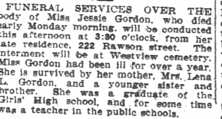 James T. and Lena Lindsey Gordon’s daughter Jessie Vaille Gordon died on 29 May 1905 in Atlanta.[38] She is buried in Atlanta’s Westview cemetery with her mother Lena.[39] Her obituary in the Atlanta Constitution the next day states that she had been sick for over a year and died at her family’s residence at 22 Rawson Street. The obituary says that Jessie was survived by her mother Lena L. Gordon and a younger sister and brother. It also indicates that she was a graduate of the Girls’ High School and was a public school teacher. Notices in the Atlanta paper on 6 January and 28 April 1905 state that she was a third-grade teacher at Bell Street School and was sick on leave of absence.