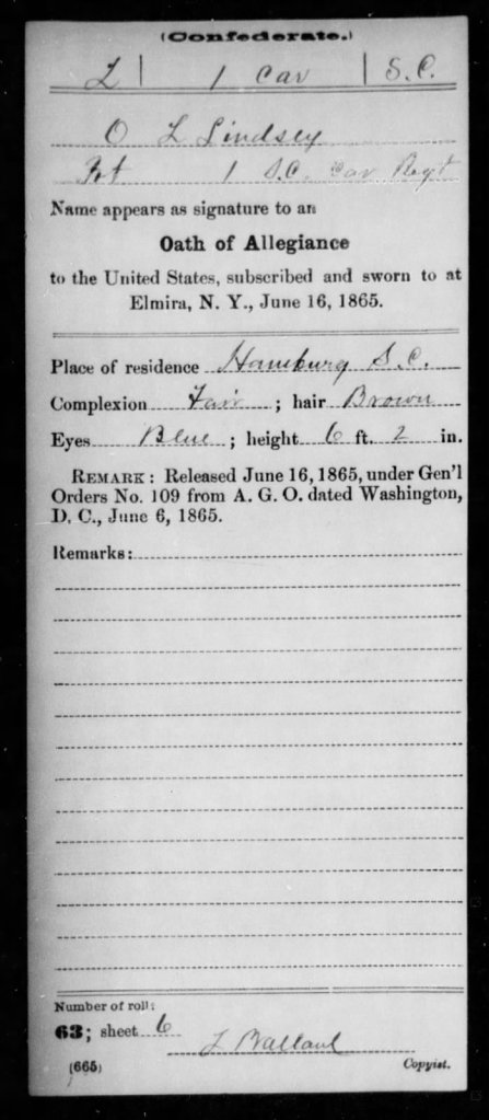 The statement of the “description list” in Oscar’s South Carolina service papers that he was farming in Edgefield District suggests that he had either gone from Spartanburg County, South Carolina, to Hamburg by 1861, when he enlisted in the Confederate army, or intended to go there after his service ended. His father Dennis Lindsey remained in Hamburg at this time, so Oscar would have been with family in that part of South Carolina, even though he remained under guardianship of his uncle Samuel Farrow Styles until he reached 21, according to the terms of the will of his grandfather Gabriel Styles.