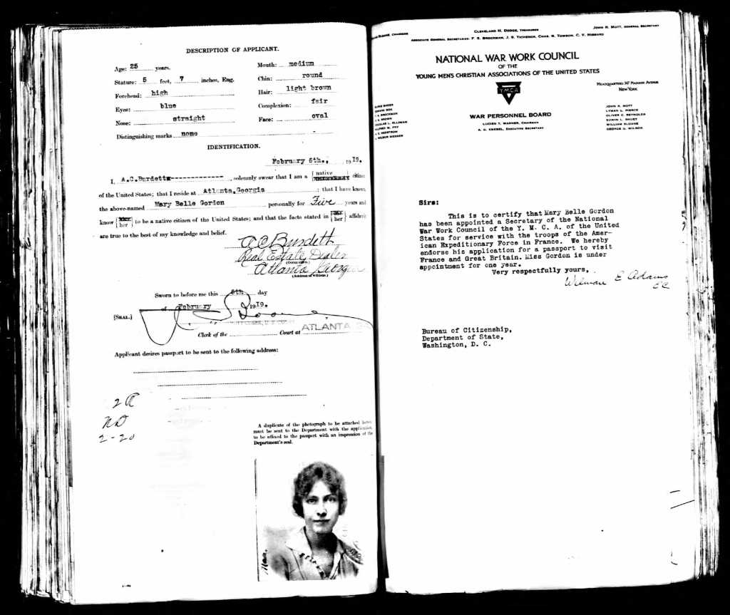 Three days after Mary Belle applied for her passport, the Atlanta Constitution published an article about her and her plans to go overseas to entertain the American troops in France.[59]
