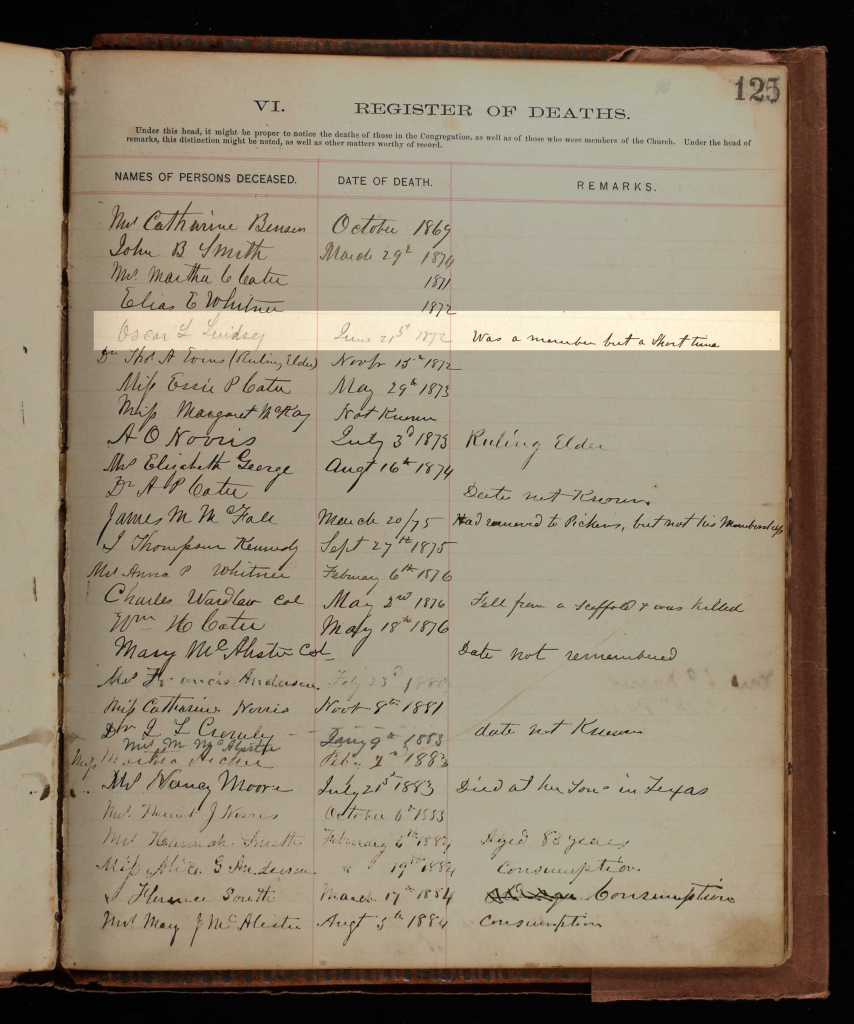 [14] See “Births, Baptisms, Deaths, First Presbyterian Church, Anderson, South Carolina, 1868-1895,” at Presbyterian Historical Society, Philadelphia, Presbyterian Church Records, 1701-1907, online at Ancestry as Presbyterian Church Records, 1701-1970.