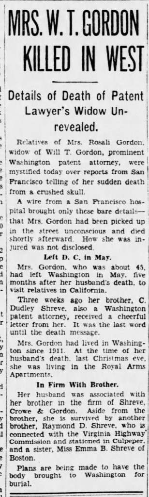 While he was living in D.C., on 14 June 1913, Will married Mary Rosalie Shreve, daughter of Arthur Berry Shreve and Anna May Baldwin of Loudon County, Virginia.[55] Rosalie is buried with Will at Rock Creek cemetery.[56] An article in the D.C. newspaper Evening Star on 6 November 1935 states that the preceding day on 5th November, Rosalie Gordon had been found unconscious on a street in San Francisco with her skull crushed.[57] She was taken to a hospital and died there. At the time the D.C. paper reported her death, information about what caused her injury was not available. The Evening Star article states that she had moved to San Francisco in May 1935 following her husband Will’s death the preceding year.