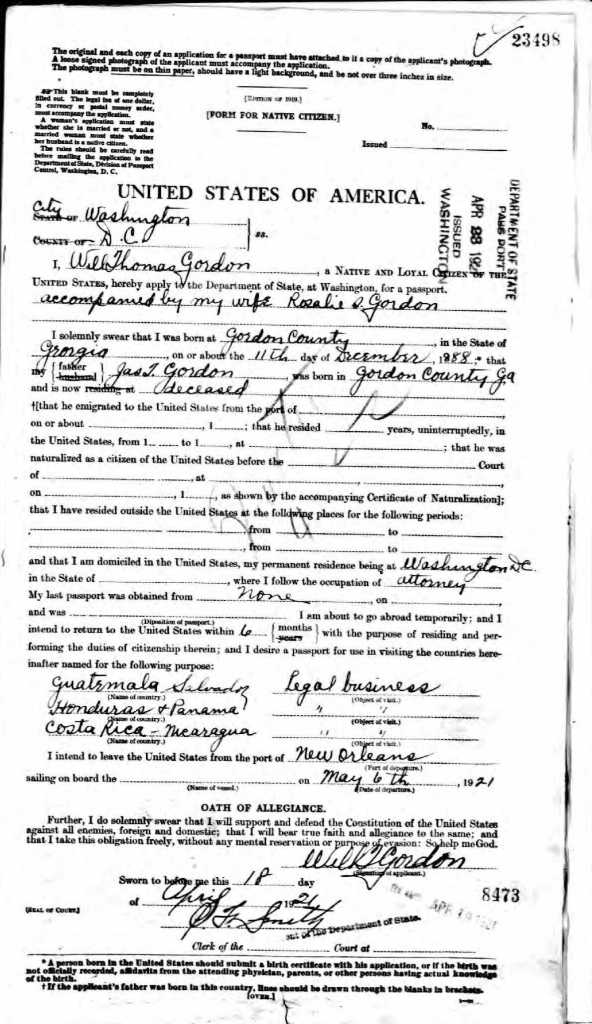 2. William Thomas Gordon was born 11 December 1888 at Oostanaula in Gordon County, Georgia, and died 24 December 1934 in Washington, D.C., where he is buried with his wife Mary Rosalie Shreve Gordon in Rock Creek cemetery. The date and place of birth are found in an application for a U.S. passport that Will T. Gordon filed 18 April 1921.[51] In his declaration for the application, Will states that he was born in Gordon County, Georgia, on 11 December 1888. The passport application also contains an affidavit given 13 April 1921 by Will’s uncle Dennis Lindsey in DeKalb County, Georgia, in which Dennis states that he had a family bible in which the date and place of his nephew Will’s birth in Oostanaula, Georgia, were recorded. The passport application has photos of Will and his wife Rosalie and states that he was 5’11” in height with blue-gray eyes, light brown hair, and fair complexion. As his sister Mary Belle’s February 1919 passport application discussed above had done, Will T. Gordon’s application states that his father was deceased. The passport application has a photo of Will (see the head of the posting).
