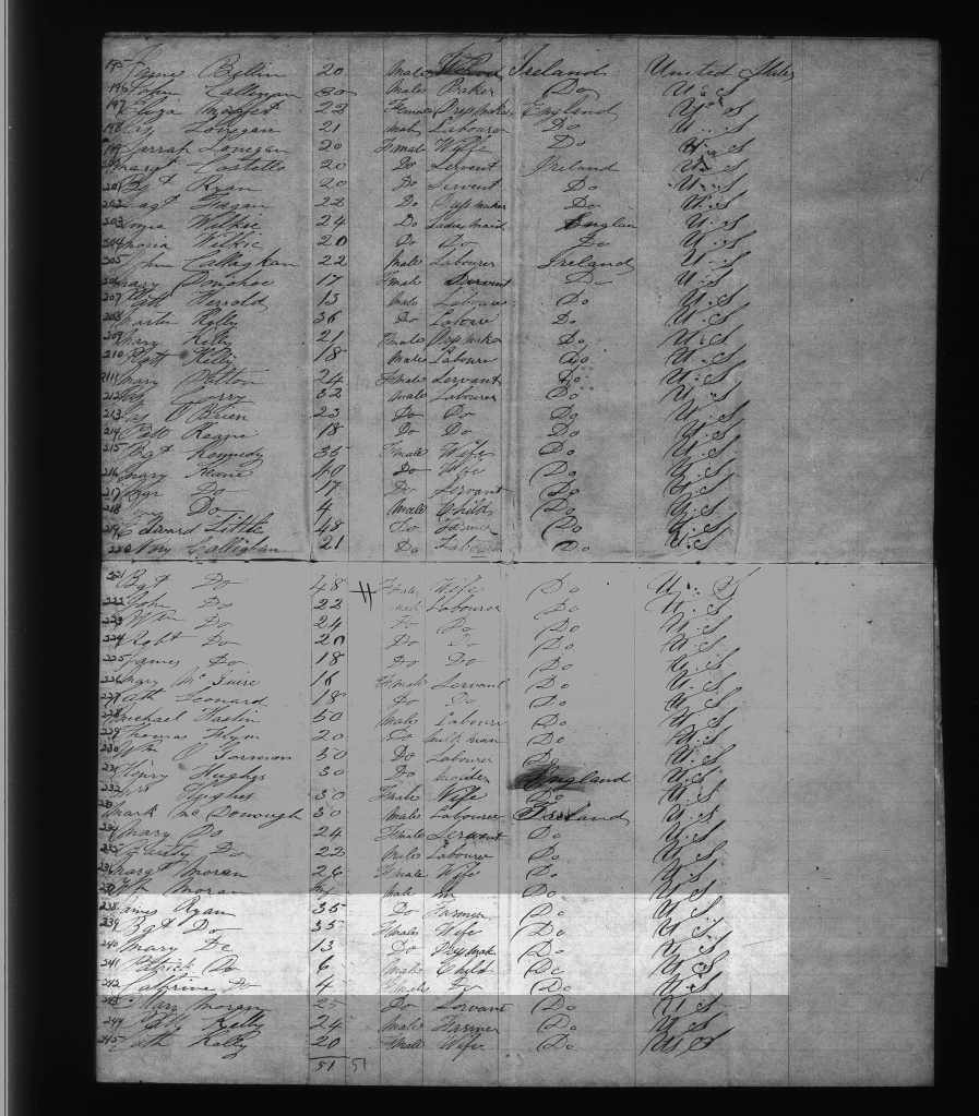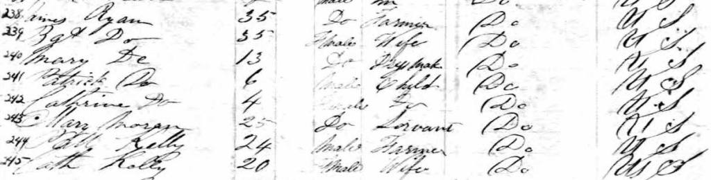 One thing in the ship’s register does not fit, however: Bridget has a husband James Ryan on the passenger list. I am not quite sure how to account for him. I’m inclined to wonder if Bridget came with her children to New Orleans under the auspices of a relative of hers or Valentine’s who registered himself for this voyage as her husband, in order to afford protection to her and the children. I have scoured the 1860 federal census to see if I can find a James Ryan with wife Bridget and the three children from the James Nesmith passenger list in the household, and I can find no such family anywhere in America — and that makes me all the more inclined to think this is a record of the arrival of Valentine Ryan’s wife Bridget and their three children in New Orleans in 1854. Though I cannot explain who James Ryan is or why he’s listed with this family on this passenger list ….