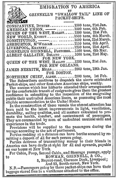An ad in the Liverpool newspaper The Mercury, dated 10 January 1854, tells us when the ship left Liverpool for New Orleans in January 1854: the ad states that the James Nesmith would sail from Liverpool on 19 January.[6] The last ad I find in The Mercury for this sailing of the James Nesmith from Liverpool to New Orleans is dated 24 January, and appears to indicate that the ship actually sailed from Liverpool on that date (The Mercury [24 January 1854], p. 4, col. 2).