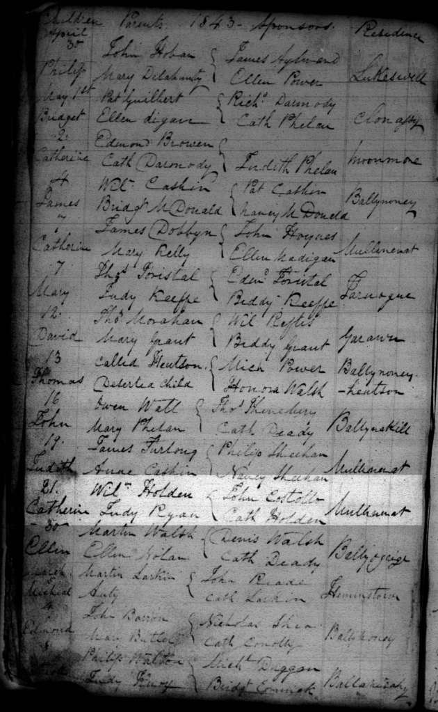 [2] The Mullinavat parish records as available on microfilm digitized by the National Library of Ireland at the website of NLI begin in 1843, but unfortunately include only baptism and marriage records, not death records.