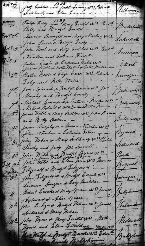 As my posting also states, I’ve concluded that, since couples normally married in the parish of the bride, Bridget Tobin’s family roots likely lie in Kilmacow parish — and perhaps in the part of that parish from which Mullinavat parish was formed in 1842. But since Kilmacow parish records apparently begin only in 1858 (though, as my posting also shows, there’s confusion about that fact when one consults various sources), finding a baptism record for Bridget Tobin naming her parents appears to be a lost cause. I have relied on a diocesan-level transcript of Catholic parish records in the diocese of Ossory to find any information I can find about Tobin families in Kilmacow and Mullinavat Catholic parishes, as I search for clues about Bridget Tobin’s family in the sparse Catholic parish records available for this area in the early 19th century.