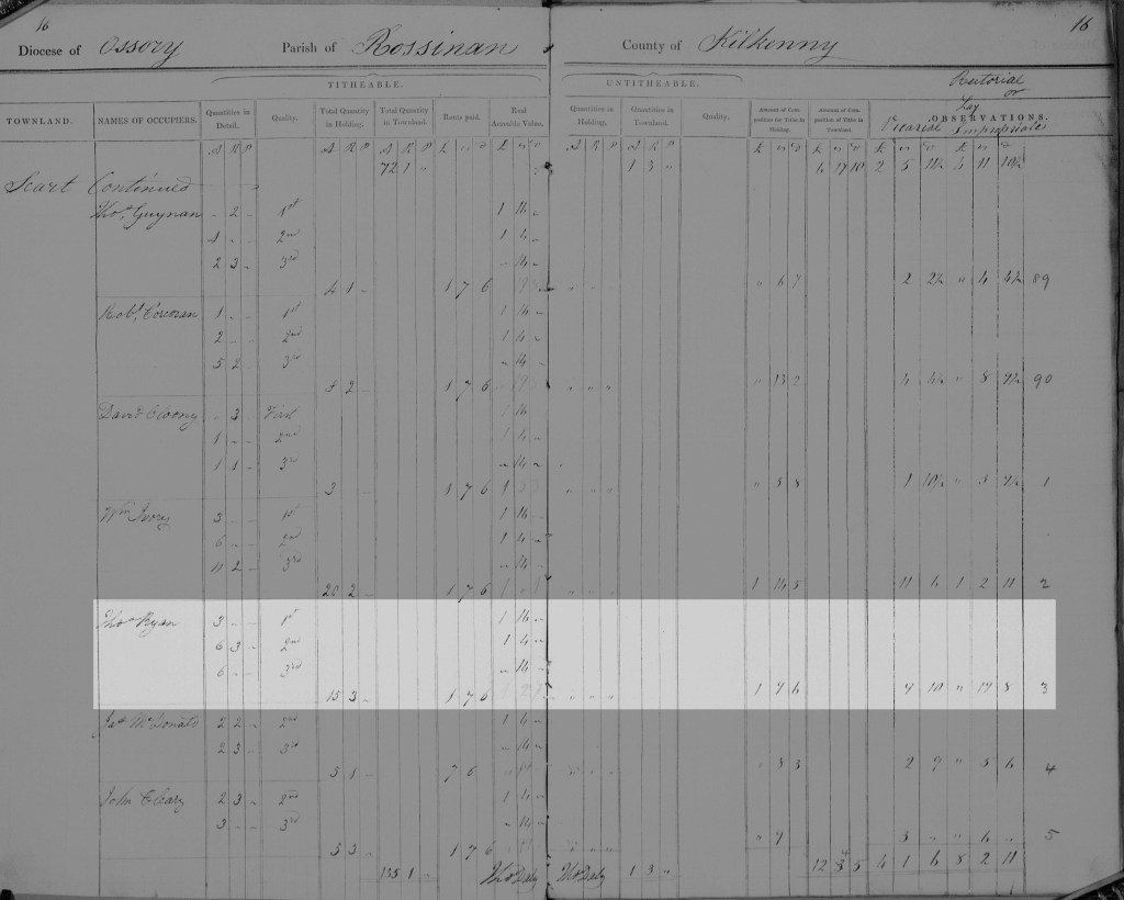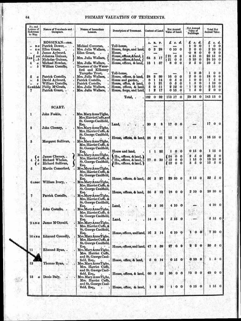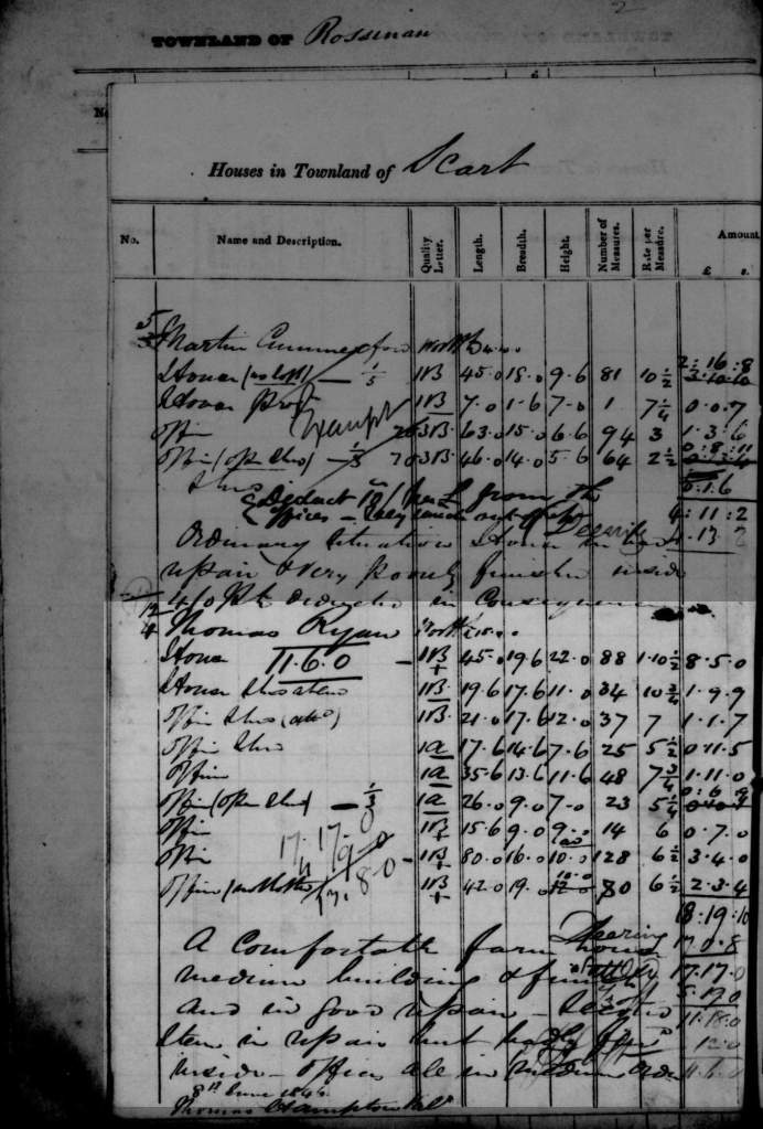 On 8 June 1846, the Field Book of the Valuation Offfice Books for Scart townland in Rossinan civil parish shows Thomas Ryan with considerable property in Scart, and a farm described as “comfortable.” His holdings in the townland included two houses and several offices, rated as in “good repair” and of good quality.