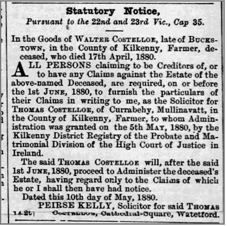 [5] “Statutory Notice … In Goods of Walter Costelloe,” Waterford News (14 May 1880), p. 2, col. 6.