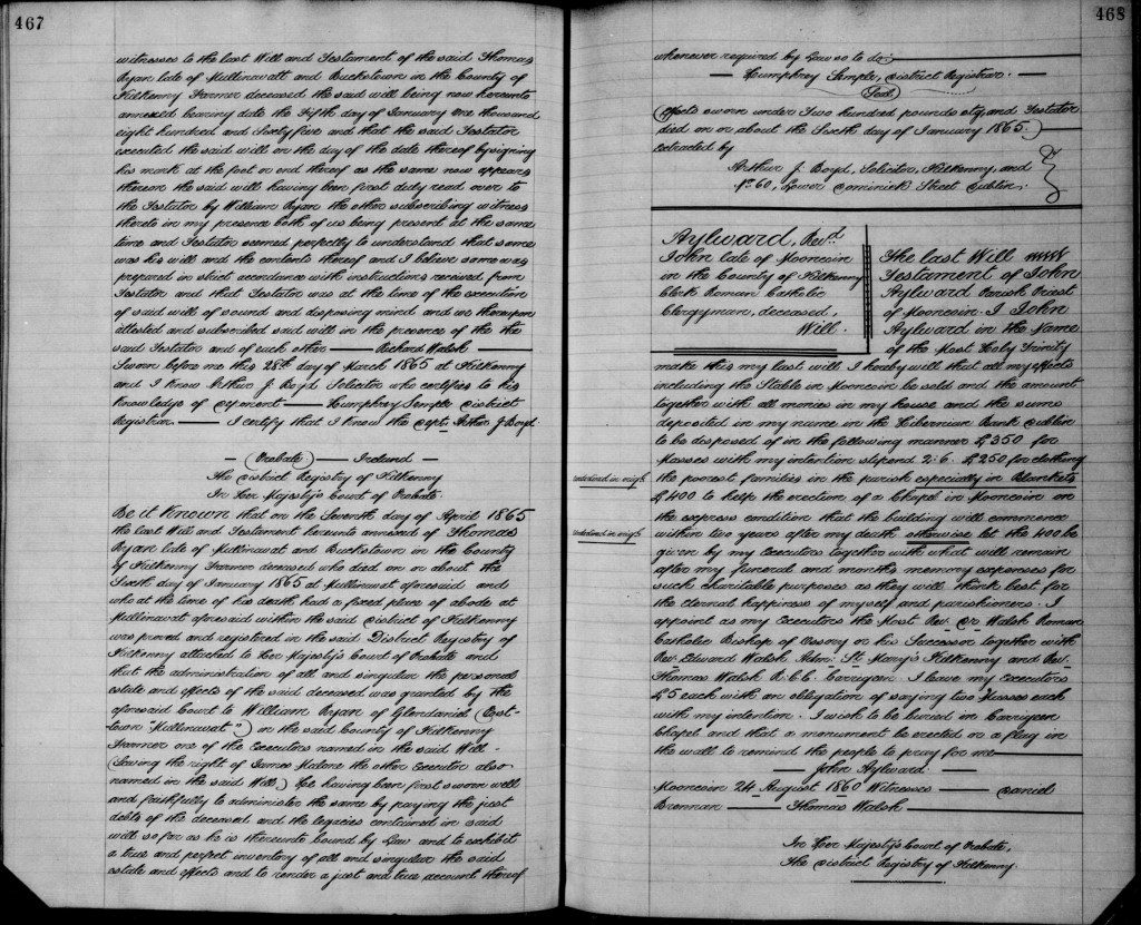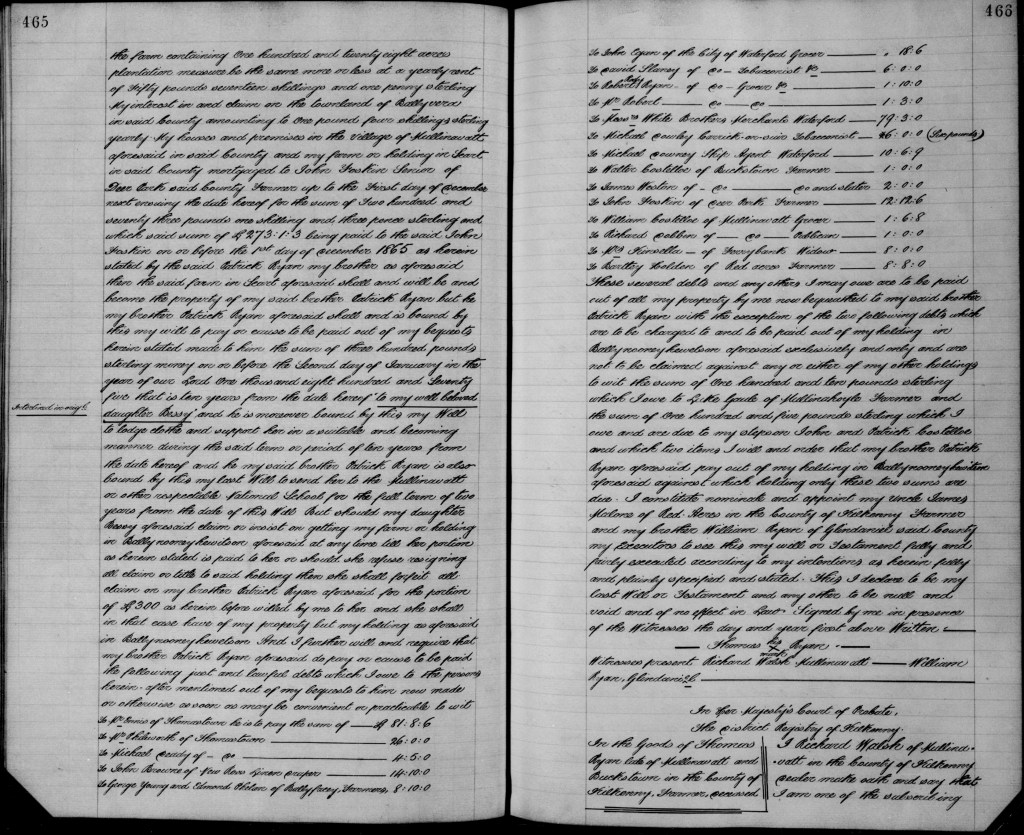 Thomas Ryan’s will was witnessed by Richard Walsh and by Thomas’s brother William Ryan. William Ryan proved and registered the will on 7 April 1865, stating that Thomas Ryan had died 6 January 1865. Richard Walsh proved the will on 28 March 1865.