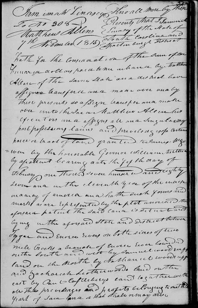 On 12 February 1828, James Lindsey deeded to Matthew Allen 160 acres on Two Mile Creek and Jemmie’s/Jamey’s Creek in Spartanburg County, out of a grant to James McGowen on 5 February 1787. The deed states that both James Lindsey and Matthew Allen were of Spartanburg County. It was signed by James Lindsey with witnesses Willis W. Dickie and C. (probably Caleb, brother of Matthew) Allen. Willis Dickie proved the deed 21 March 1828 and it was recorded 1 March 1830.[41]
