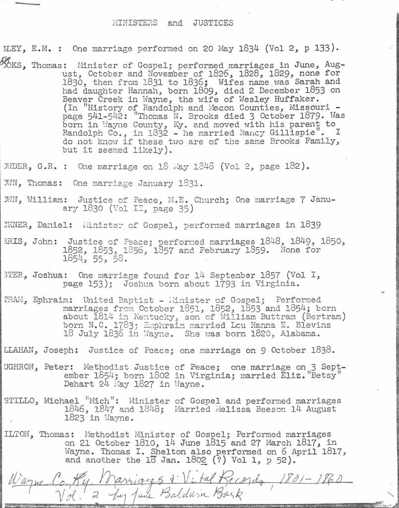 [50] June Baldwin Bork, Wayne County, Kentucky, Marriages and Vital Records 1801-1860 (priv. publ., Huntington Beach, California, 1972), vol. 2. (Page number is missing from my photocopy of Bork’s summary of Thomas Brooks’s ministerial history in Wayne County.)