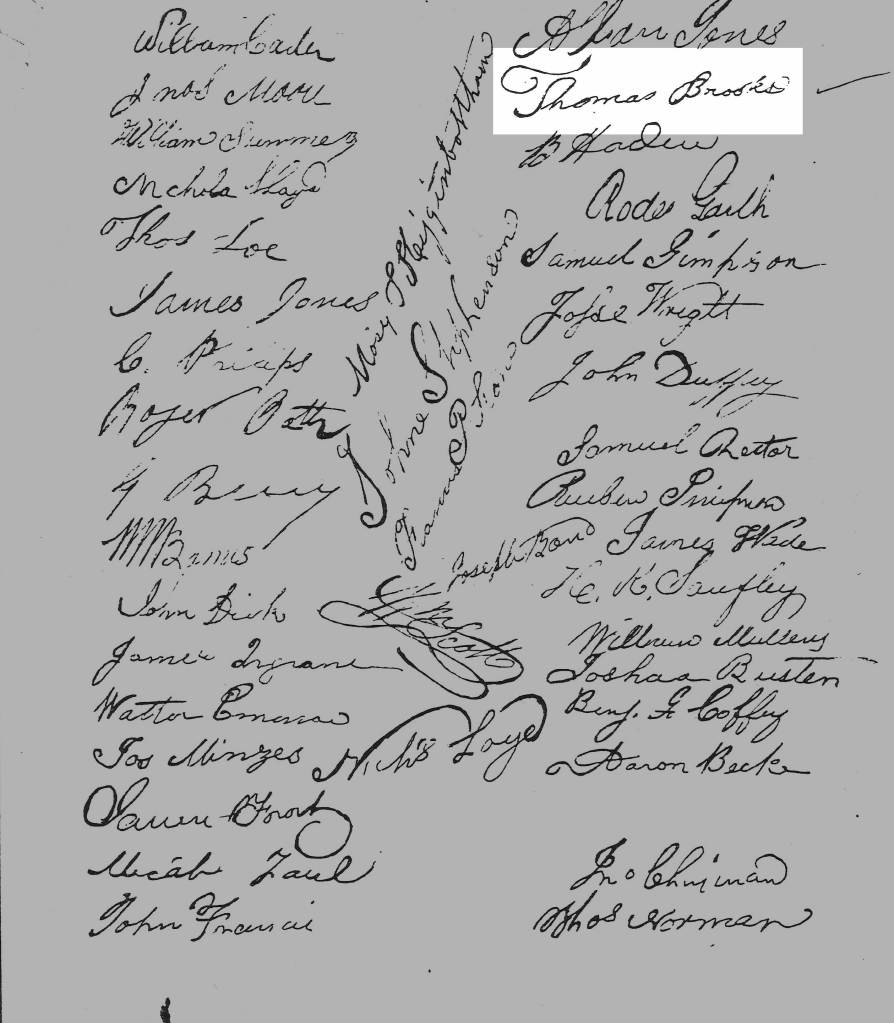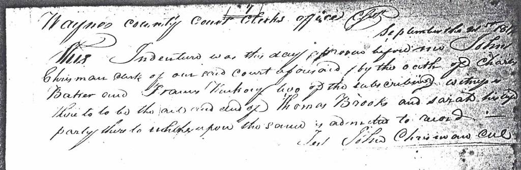 In one of her volumes of Wayne County records, June Baldwin Bork notes that Thomas Brooks was a Methodist minister in Wayne County, performing marriages in the period 1826-1836.[50] As a previous posting notes, among the marriages I find Thomas performing in Wayne County was the marriage of George Bruton’s daughter Eliza to Daniel Sandusky on 20 July 1828. The marriage file for this marriage has a note from George Bruton giving his permission. Bork also includes in this book a page of signatures taken from Wayne County court records in 1817, including Thomas Brooks’s signature.[51]