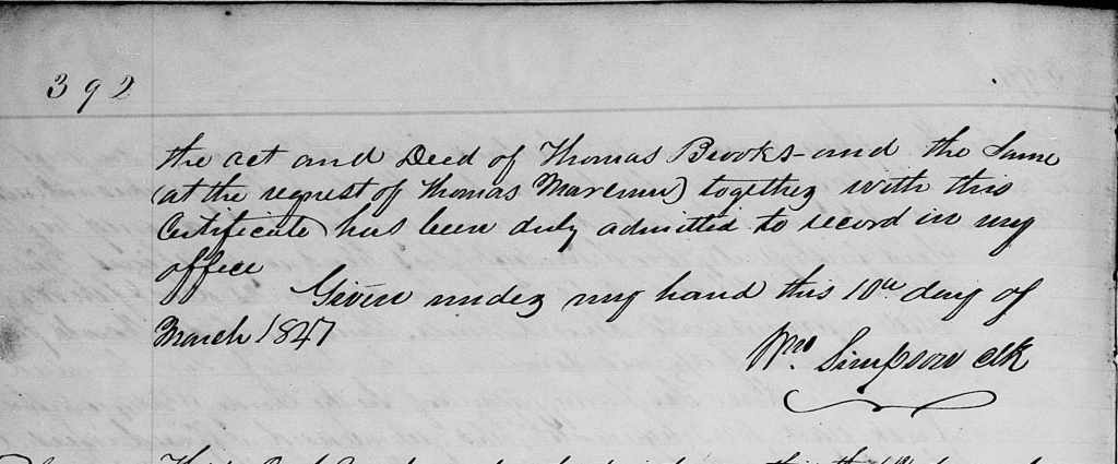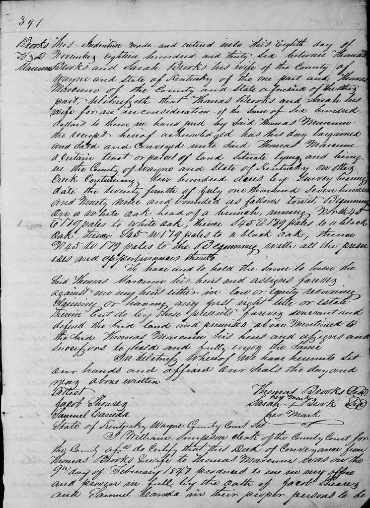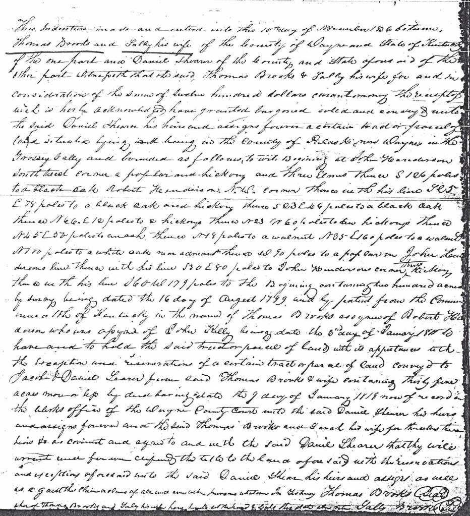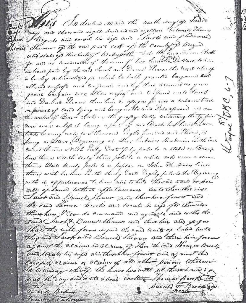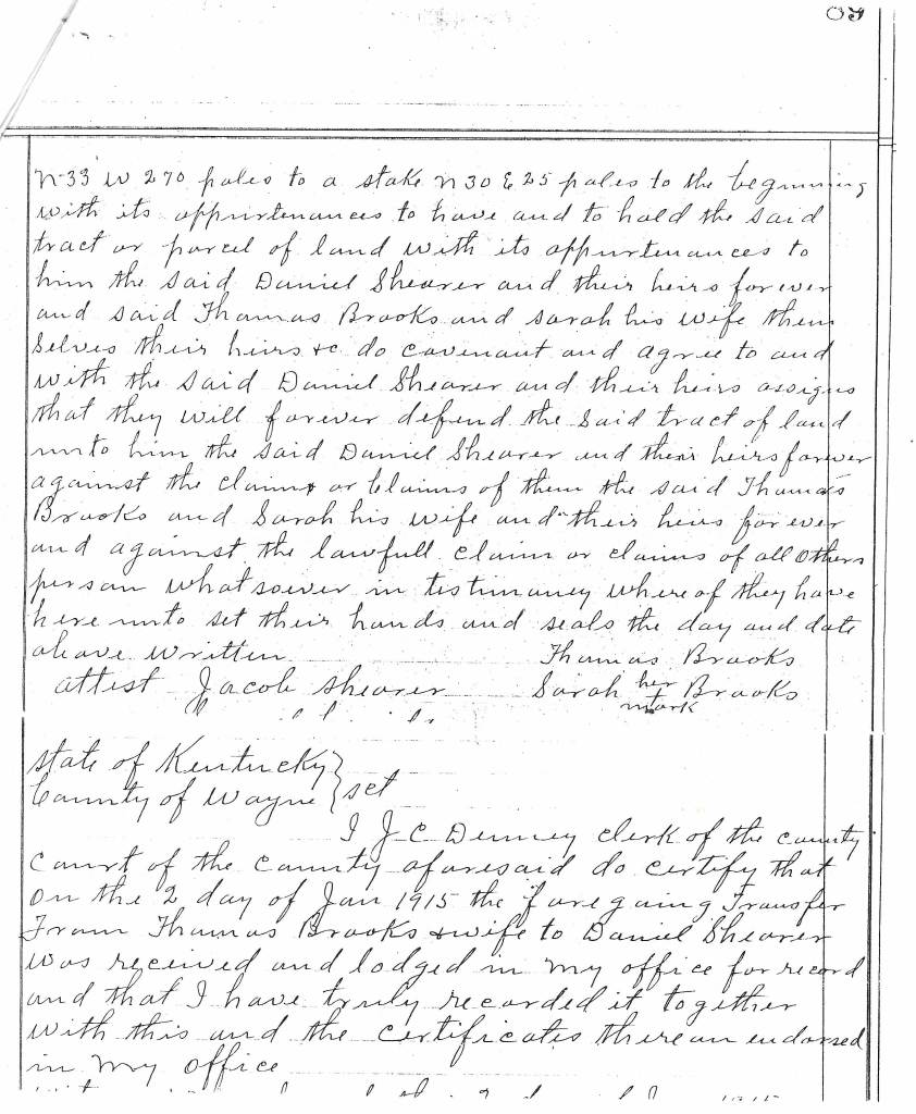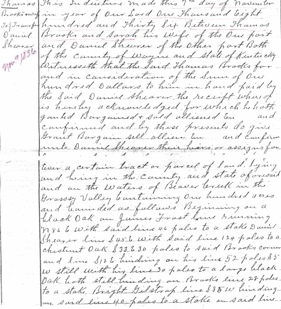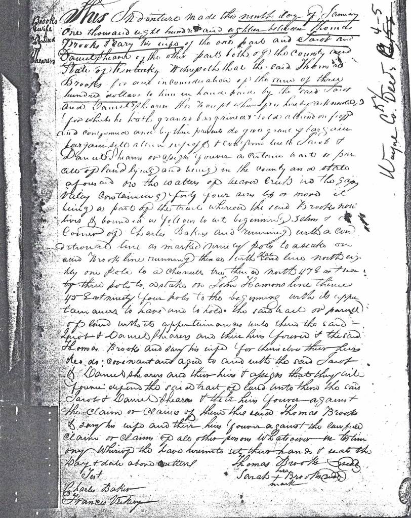 In 1818, Thomas Brooks and wife Sarah sold several pieces of land in Wayne County to Jacob and Daniel Shearer. The first sale was on 9 January 1818, when Thomas and Sarah sold the Shearers 44 acres on Beaver Creek in Grassy Valley for $300.[29] The deed notes that this land was part of the land on which Thomas and Sarah Brooks were then living, and was bounded by Charles Baker, John Hammons, and Daniel Shearer. Thomas signed, with Sarah making her mark, and the deed was witnessed by Charles Baker and Frances Vankory and proven by both witnesses on 21 September 1818.