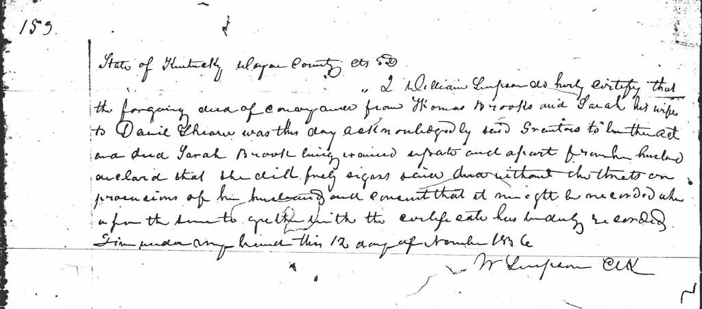 On 10 November 1836, Thomas and Sarah sold another 200 acres to Daniel Shearer, with the deed noting that the land was in Grassy Valley in both Wayne and Pulaski Counties, and bordered John Henderson and John Lear.[64] The deed further states that this land was the 200-acre tract that Thomas had patented on 16 August 1799. This deed states that both Thomas and Sally signed; there were no witnesses. On 12 November, Thomas and Sarah acknowledged the deed, with Sarah relinquishing her dower rights.