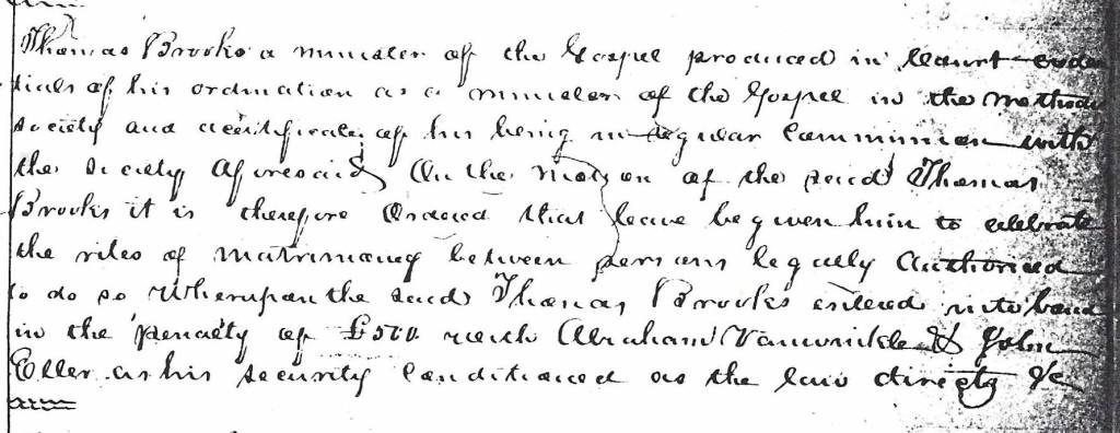 Wayne County court minutes for 29 March 1826 court session show Thomas Brooks presenting the court his credentials of ordination as a Methodist minister, whom the court certified to perform marriages in the county.[49] The court record states that, as Thomas Brooks presented his ordination credentials, Abraham Vanwinkle and John Eller gave bond with him in the amount of £500.