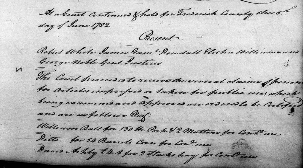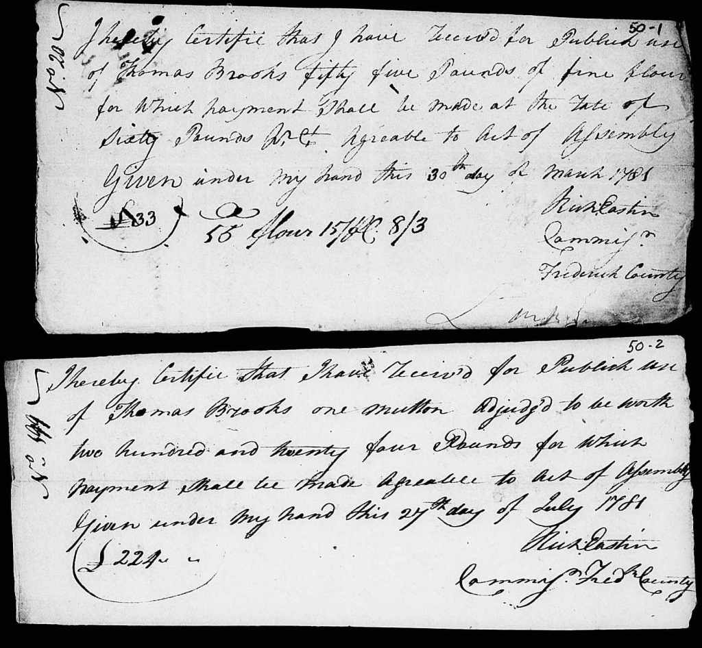 The next Frederick County record I find for Thomas Brooks are receipts made by the Frederick County commissioner Richard Eastin on 30 March and 27 July 1781 for 55 pounds of wheat and a mutton he donated on those two dates for the use of the troops of the Continental Army.[56] As Frederick County court minutes for 5 June 1782 tell us, these goods were “impressed” from local citizens for public use — that is, for the use of the Revolutionary army. Court minutes for this session show Thomas Brooks registering his claim for the 55 pounds of flour he had provided the troops.[57] The receipt for the flour and mutton Thomas gave the troops tell us he was paid for these items 1 September 1783.
