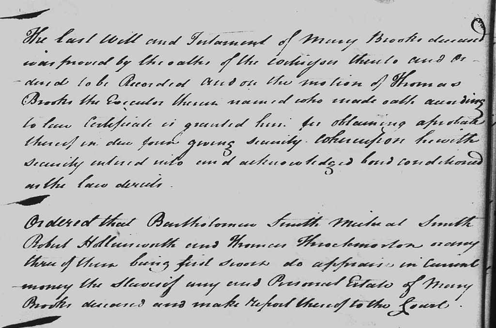 More to note in the March 1767 deed of Patrick Rice to John Rice that Thomas Brooks witnessed: note the name Robert Hollingsworth, another of the witnesses. Patrick Rice’s 9 June 1798 will in Frederick County tells us that Robert Hollingsworth was Patrick’s son-in-law, husband of Patrick’s daughter Susanna Rice.[10] Susanna was born 24 August 1751, according to her father’s bible. As we’ll see later, when Mary Brooks’s will was proved at Frederick County court on 4 April 1787, one of those the court appointed to appraise Mary’s estate was Robert Hollingsworth.[11]