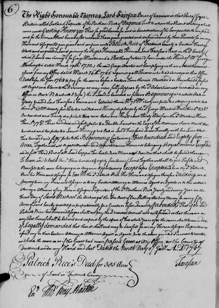 Here’s the original patent to Patrick Rice for the 385 acres he sold to his son John on 2-3 March 1767.[6] The patent, which is found in the Northern Neck grant books, confirms that the patent was made to him on 8 January 1752 by Lord Fairfax, whose land adjoined this piece of land. The patent also states George Martin had originally had the land surveyed, but failed to pay for it in the appropriate period of time and Patrick Rice claimed it. The patent also tells us that George Washington surveyed this tract.