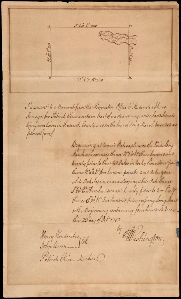 Osher Map Library at the University of Southern Maine has in its collections a survey done by George Washington for Patrick Rice on Long Marsh in Frederick County on 20 October 1750. This land lay at the head of Long Marsh, according to the land description, and the plat shows Long Marsh Creek starting within the tract of land. A digital image of the document is online at the website of Osher Map Library.[7]