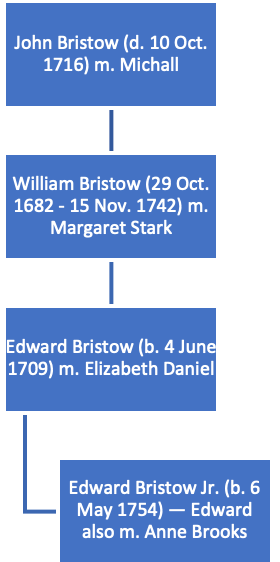 The Christ Church register also shows us a James Bristow marrying Mary Brooks on 9 December 1770. James was the son of William and Ruth Bristow and was born 28 September 1747 according to the Christ Church register.[48] Edward Bristow Jr., who married 1) Mary Beamon/Beamon and 2) Anne Brooks was a son of Edward Bristow Sr. and Elizabeth Daniel. Edward Bristow Sr. was a brother to William Bristow who married Ruth.[49] These Bristows descend from a John Bristow who died in Christ Church parish on 10 October 1716, and whose wife was Michall, according to the parish register.[50] John made his will in Middlesex County on 20 February 1716.[51]