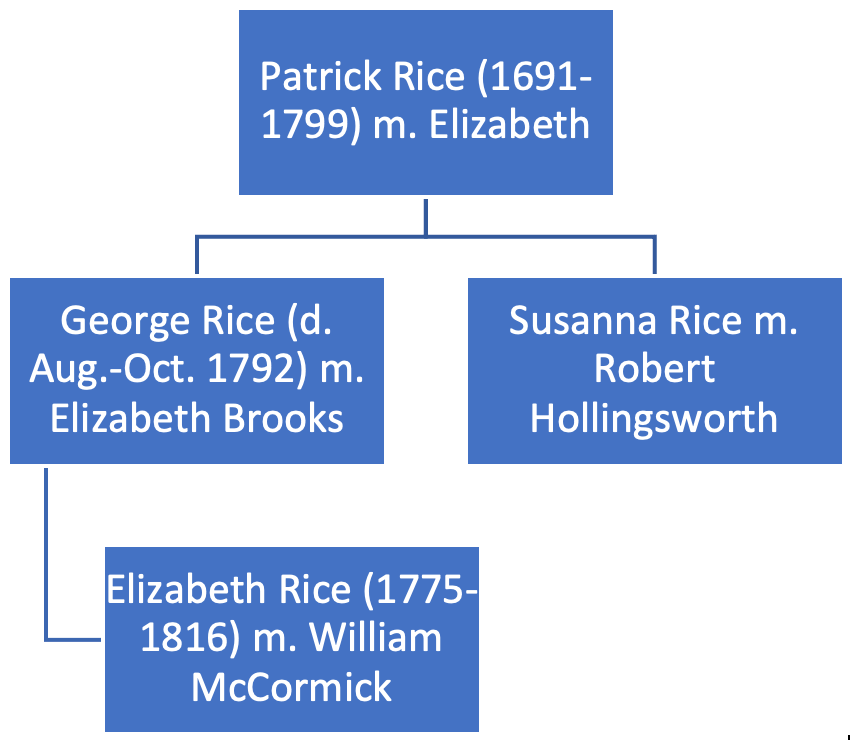 And there’s more to note in the March 1767 deed of Patrick Rice to John Rice witnessed by Thomas Brooks and others: the Andrew McCormick witnessing the deed along with Thomas Brooks and others (the original document spells his surname as McCormack) was the son of John McCormick (abt. 1703-1769) of Frederick County. John’s son Francis McCormick (1734-1794), who married Ann Province, was father of William McCormick (1768-1819), who married Elizabeth Rice (1775-1816), a daughter of George Rice and Elizabeth Brooks.[15]