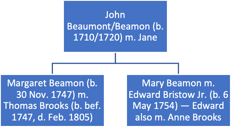 Mary Beamon/Beaman is very likely, I think, a sister of Margaret Beamon who married Thomas Brooks in January 1771 — and the fact that Edward Bristow Jr.’s second marriage to Anne Brooks occurred a day after Thomas Brooks and Margaret Beamon married suggests to me that Anne is likely a relative of Thomas Brooks. The Christ Church register shows John and Jane Beamon/Beaman having three daughters after Margaret and her oldest sisters Elizabeth and Sarah; the last three daughters are not named in the parish register, but their dates of birth are recorded: 17 December 1748, 12 June 1752, and 1 July 1754. I suspect that one of these three daughters of John and Jane Beamon/Beamon is the Mary Beamon/Beamon who married Edward Bristow Jr. on 19 March 1770.