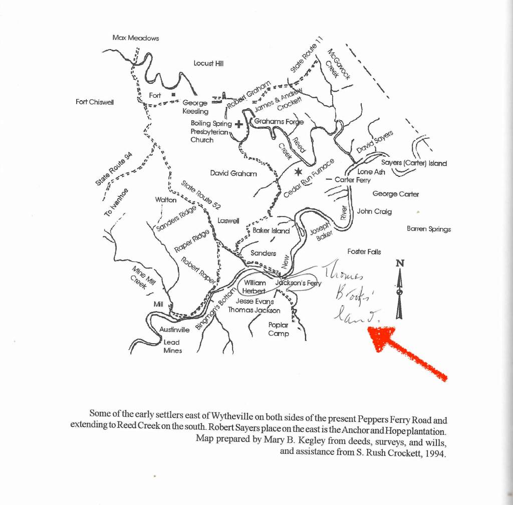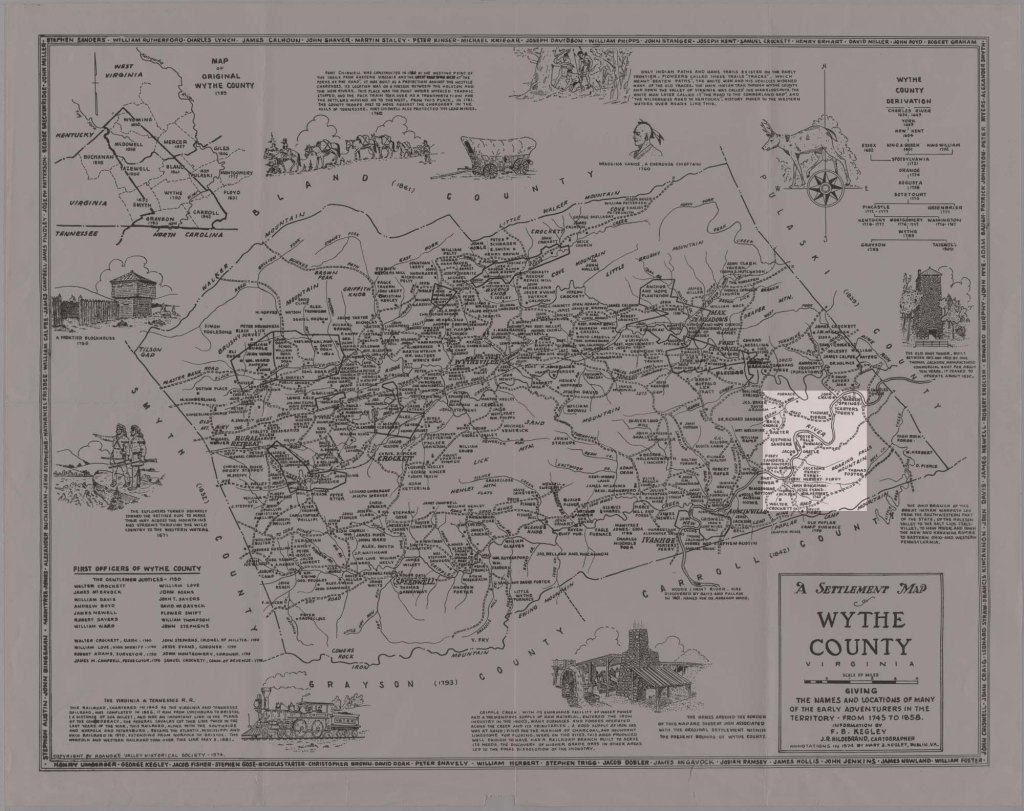 [32] John R. Hildebrand, F.B. Kegley, Mary B. Kegley ,and Roanoke Valley Historical Society, A Settlement Map of Wythe County, Virginia: Giving the Names and Locations of Many of the Early Adventurers in the Territory — From 1745 to 1858 (Roanoke, Virginia: Roanoke Valley Historical Society, 1974).
