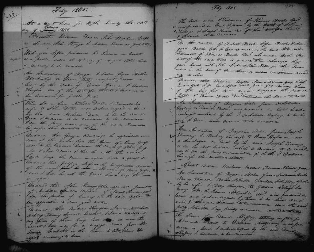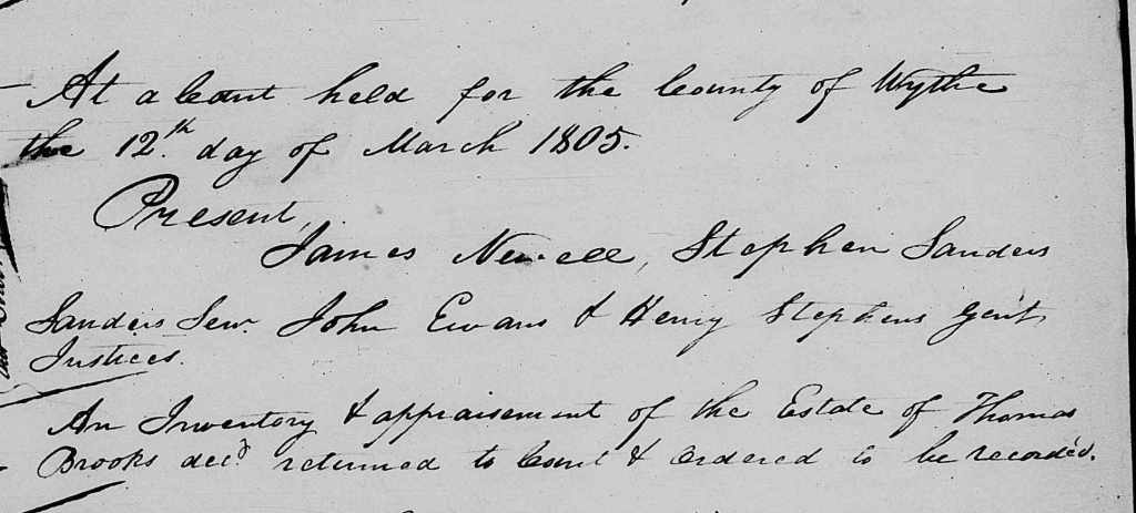 Wythe County court minutes for 12 February 1805 show Margaret, Robert, and Jesse Brooks presenting Thomas Brooks’s will to the court on that date, and giving bond in the amount of $1,000 for execution of the will with John Jenkins and John Folks Jr.[66] The court ordered William Carter, James Newell, John and Jesse Evans, and David Peirce, or any three of them, to appraise the personal property of the estate.