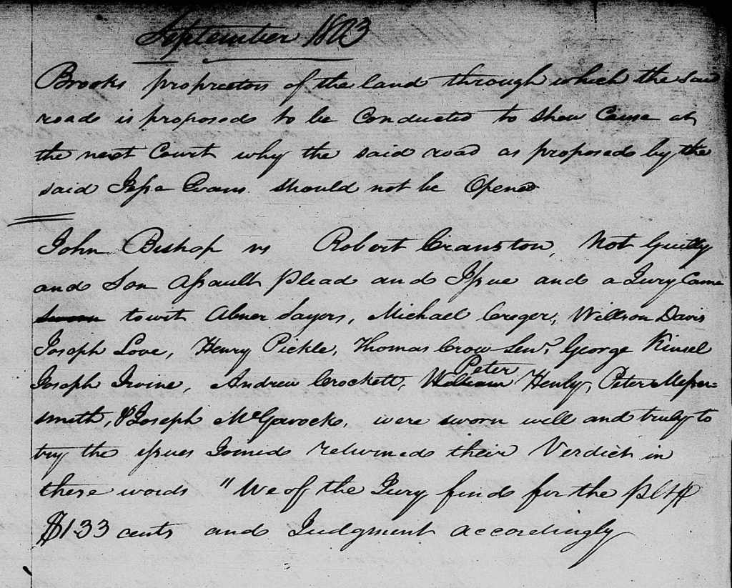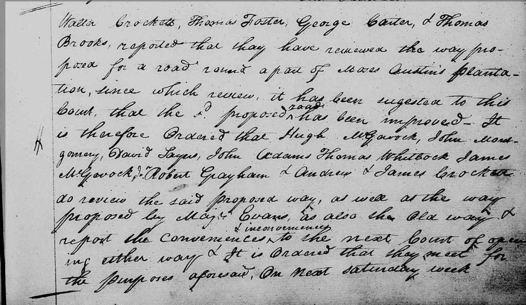On 13 September 1797, Thomas Brooks reported to Wythe court along with Walter Crockett, Thomas Foster, and George Carter that they had viewed the road that the court had requested on 16 June that they view. Court minutes note that Major (Jesse) Evans had proposed the road and that since its initial proposal, a suggestion for an improved road had been made. To this end, the court ordering that Hugh McGarrick, John Montgomery, David Sayers, Thomas Whitlock, James McGavock Jr., Robert Graham, and Andrew and James Crockett view the suggested improved route and report to court.[33]