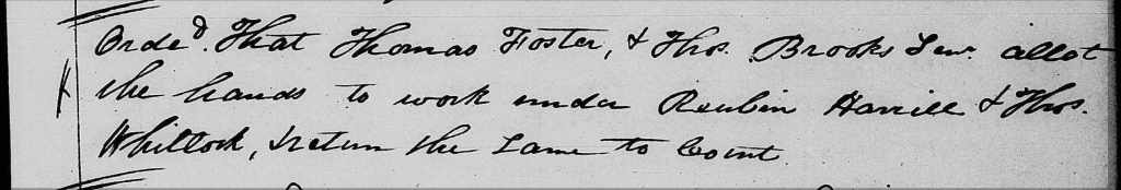 On 14 February 1798, Wythe court ordered Thomas Foster and Thomas Brooks Sr. to allot hands to work the road under supervision of Thomas Whitlock and Reubin Harrill and to return a report to court.[34] This is the first designation I find of Thomas Brooks in Wythe court records as Sr. or Jr.