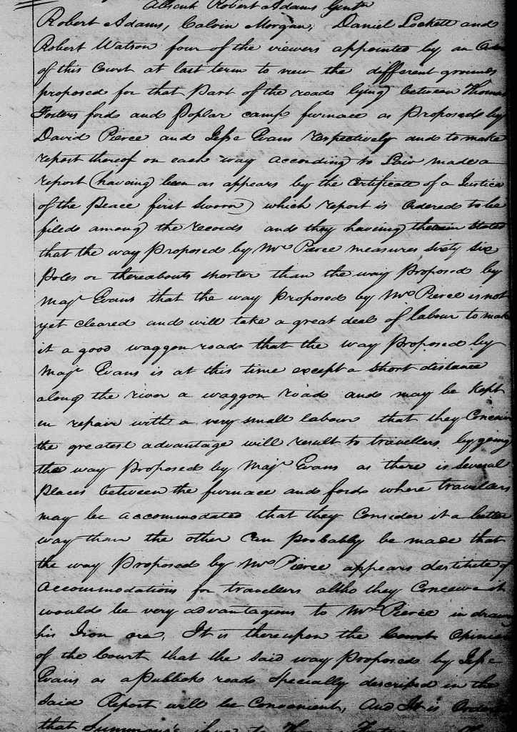 On 15 September 1803, Wythe County court noted that the most convenient way for the road from Poplar Camp furnace to James Crockett’s furnace was along New River, as proposed by Jesse Evans. This road would, the court decided, be easier to build than an alternate one proposed by Pierce, which would perhaps have made drawing iron ore from the mines easier. In addition, the river route had accommodation for lodgers. Since this road would pass through the land of Thomas Brooks and Thomas Foster, they were ordered to show cause why it should not be opened.[49]