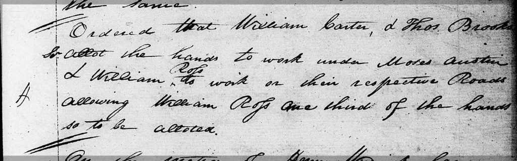 Starting in 1796, Wythe County court order books begin to provide us with important information about where Thomas Brooks lived in the county and who his neighbors were. On 9 March 1796, the court order books show Thomas ordered by the court along with William Carter to allot hands to work a county road under Moses Austin and William Ross.[23] Since Thomas Brooks’s son Thomas Jr. had married the preceding month and was now living on his own with wife Sarah, it’s possible, of course, that this record — which does not use the Sr.-Jr. designation — refers to the son and not the father, but I think this is more likely a record pertaining to Thomas Brooks Sr.