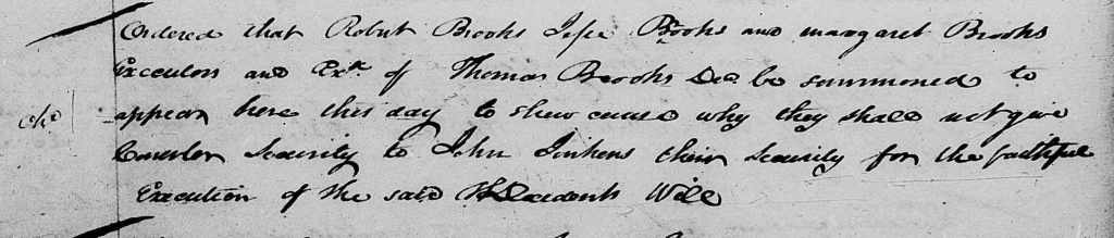 For a brief addendum to this posting discussing pieces of information I’ve found regarding the handling of Thomas Brooks’s estate by his executrix Margaret Brooks and executors Jesse and Robert Brooks, please see this subsequent posting.