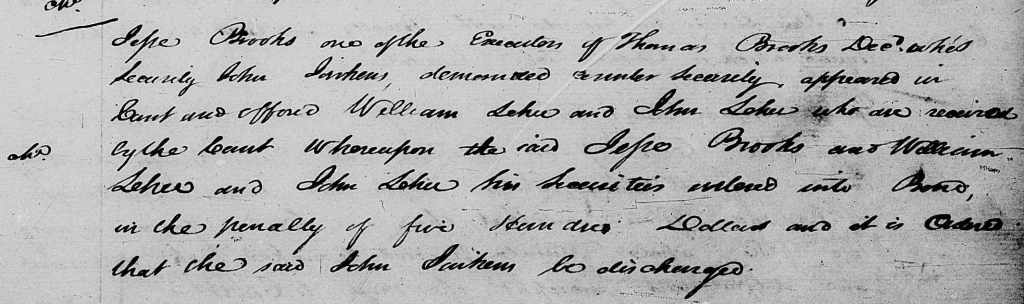 Court minutes for the following day, 9 October, say that Jesse Brooks, executor of Thomas Brooks, had appeared in court with William and John Lehue, who gave bond with him for his execution of the estate — evidently replacing Jenkins, who had wanted to be released from his bond obligation, it appears.[71] William and John Lehue/Lahue/Lehew were brothers, sons of William and Hannah Lehew. John was Jesse Brooks’s brother-in-law. He married Jesse’s sister Sarah in November 1804 in Wythe County.