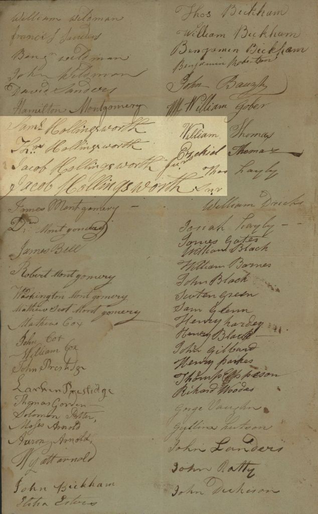 On 29 June 1802, a Jacob Hollingsworth signed a petition to Governor Tattnall of Georgia, informing the governor that the petitioners (who are not identified as from any particular county) had petitioned President Thomas Jefferson to appoint Colonels Carnes, Easley, and Harris, and Captain James Blair as commissioners to treat with the Cherokee Indians.[56] The petitioners were seeking to obtain a tract five miles wide between the Tugaloo and Apalachee Rivers. The Jacob signing this petition may well be Jacob, son of Samuel Hollingsworth (abt. 1740-1810), brother of Jacob Hollingsworth (1742-1822). That Samuel also signed the petition, using a mark. The petition has as well the signature of Samuel’s son Isaac.