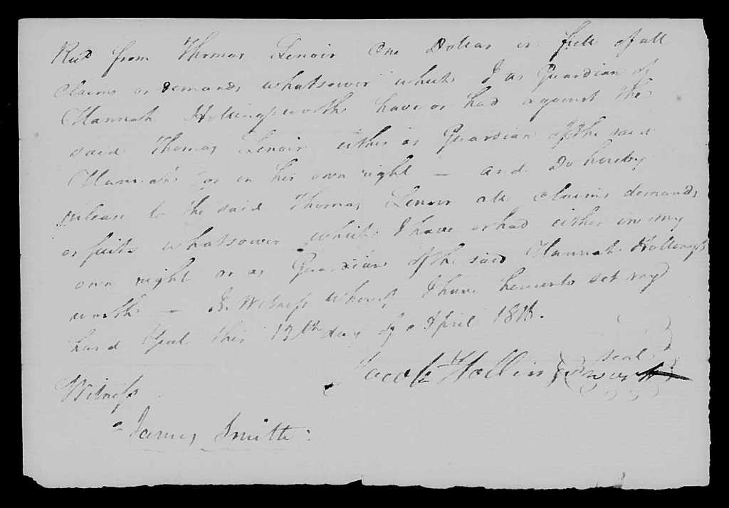 Jacob Hollingsworth’s son Samuel died in Franklin County before 6 August 1802. When his property was sold in Franklin County on 27 December 1803, a Jacob Hollingsworth who might be either Samuel’s father or his brother was a buyer at the estate sale.[57] Samuel’s loose-papers estate file shows Jacob signing a receipt to Thomas Lenoir on 12 April 1816 for Jacob’s guardianship of Samuel’s daughter Hannah, who had come of age and would marry the following year.[58]