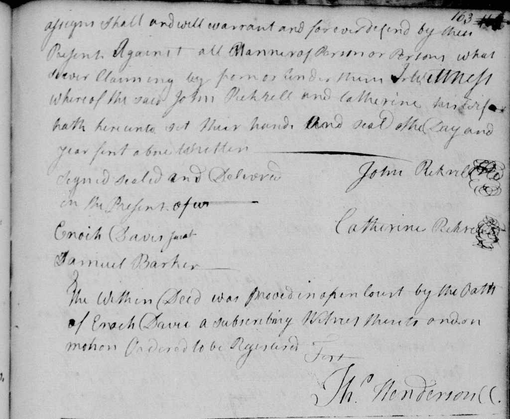 The 9 March 1772 deed of John and Catherine Pickrell in Guilford County, North Carolina, to Jacob Hollingsworth shows the Pickrells and Jacob living in Guilford at the time, and shows Jacob buying 100 acres in Guilford County at the mouth of Broad Mouth Creek.[20] The deed was witnessed by Enoch Davis and Samuel Barker; Enoch gave oath and the deed was recorded, with no recording date stated. Jacob also appears in Guilford County records on 20 February 1775, when he witnessed a deed by Thomas and Elizabeth Davis to Levi Branson in Guilford.[21]